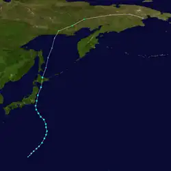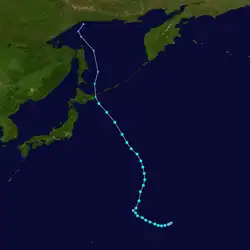 During July 21, a subtropical disturbance developed at the tailend of a mid-latitude trough of low pressure, about 775 km (480 mi) to the east of Iwo-To.[53] Over the next day, deep atmospheric convection developed over the system's elongated low level circulation center, before it was classified as a tropical depression by the JMA during July 22.[53][54] Over the next day, as the storm moved north-northeastwards around a subtropical ridge of high pressure, its structure improved as it developed a warm core and consolidated.[55] The hybrid system was subsequently classified as Tropical Storm 04W by the JTWC during July 23, before the JMA named it Lupit later that day.[54][55] Over the next day, Lupit peaked with sustained winds of 75 km/h (47 mph), as it went through an extratropical transition and took on frontal characteristics.[54][56] Lupit subsequently became extratropical during July 24, before it dissipated during July 26, as it moved into the Sea of Okhotsk.[54]