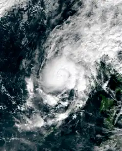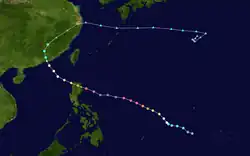 On July 2, a tropical depression formed 780 km (480 mi) to the southeast of Yap State.[31][32] The following day, the depression became a tropical storm, receiving the name Nepartak.[31] By July 4, organization increased and Nepartak intensified into a severe tropical storm.[31] At that time, PAGASA assigned the local name Butchoy as it entered their area of responsibility.[33] Early on July 5, Nepartak started to undergo rapid intensification, reaching typhoon strength.[31] Nepartak soon reached Category 5 super typhoon intensity.[nb 5][34] During the course of July 6, Nepartak reached its peak intensity with 10-minute sustained winds of 205 km/h (125 mph) and a minimum barometric pressure of 900 mbar.[31][35] Nepartak started weakening during the next day, before making landfall in Taitung City on July 8. Nepartak weakened to a tropical storm[31][36] as it made its second landfall in Shishi, Fujian.[37] Nepartak rapidly deteriorated over land and fully dissipated on July 10.[31][38]