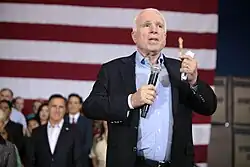 Further compounding matters for McCain was his relationship with the Arizona Republican Party.[5] After his re-election in 2010, McCain adopted more orthodox conservative stances and attitudes and largely opposed actions of the Obama administration. By 2013, however, he had become a key figure in the Senate for negotiating deals on certain issues in an otherwise partisan environment. By early 2014, McCain's apostasies were enough that the Arizona Republican Party formally censured him for having what they saw as a liberal record that had been "disastrous and harmful". The action had no practical effect but showed that McCain's history of being criticized at the state level as insufficiently conservative was still ongoing.[12] Tea Party leaders have said that they are "sick to death" of McCain and will oppose him if he seeks re-election,[5] with one prominent critic of McCain saying that Arizona conservatives were preparing for a "civil war".[6] However, McCain still had a large warchest – $1.7 million as of June 2014 – and would be helped by Arizona state law, which allows independents to vote in the Republican primary.[5]
