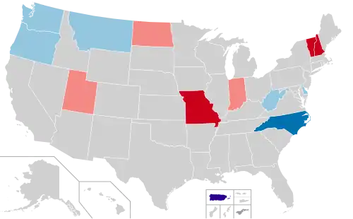 Regular elections were held for the governorships of 11 U.S. states and two U.S. territories. Additionally, a special election was held in Oregon after the resignation of John Kitzhaber as governor. Republicans won a net gain of two seats by winning open seats in Missouri, Vermont, and New Hampshire while Democrats defeated an incumbent in North Carolina. However, Governor Jim Justice of West Virginia switched his party affiliation to Republican shortly after his inauguration, thereby netting Republicans 3 seats and giving them 34 seats nationwide, tying their record set in the 1921 elections.
