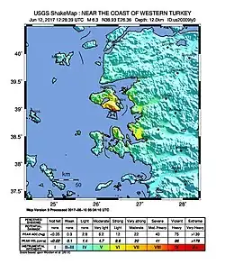 - ^ a b Utkucu, M.; Nalbant, S.S.; Pınar, A.; McCloskey, J.; Nicbhloscaidh, M.; Turhan, F.; Yalçın, H.; Kızılbuğa, S.; Coşkun, Z.; Ertan, E.K.; Gülen, L. (2021). "The June 12, 2017 M6.3 Karaburun-Lesvos earthquake of the Northern Aegean Sea: Aftershock forecasting and stress transfer". Tectonophysics. 814 (228945). doi:10.1016/j.tecto.2021.228945.