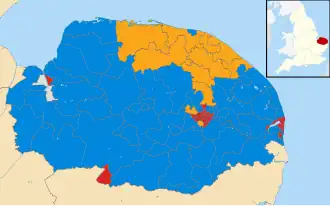 ![]() Map showing the results of the 2017 Norfolk County Council elections. | ||||||||||||||||||||||||||||||||||||||||||||||||||||||||||||||||||||||||||||||||||||||||||||||||