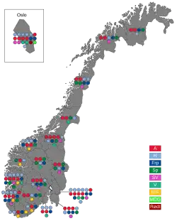 Parliamentary elections were held in Norway on 11 September 2017 to elect all 169 members of the unicameral Norwegian Parliament, the Storting. The non-socialist parties retained a reduced majority of 88 seats, allowing Prime Minister Erna Solberg's Conservative-Progress coalition to remain in government.[1][2] The Liberal Party joined the coalition in January 2018 but it remained a minority cabinet until the Christian Democratic Party joined the coalition in 2019. The three largest centre-left parties won 79 seats. The Green Party retained its single seat, while the Red Party won its first ever seat.