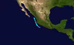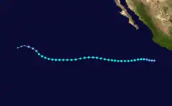 On July 28, the NHC noted the possibility of an area of low pressure well south of Mexico developing over subsequent days.[89] An area of disorganized showers and thunderstorms associated with a tropical wave materialized three days later, but little change occurred thereafter.[90] Early on August 3, a surface circulation formed in association with concentrating convection,[91] and this process led to the formation of a tropical depression by 06:00 UTC the next day.[92] The newly formed cyclone did not intensify after designation, and its low- and mid-level circulations separated by over 265 mi (425 km) on August 5 due strong easterly wind shear.[93] Falling short of the tropical storm criteria, the short-lived depression was declared a remnant low at 18:00 UTC that day.[92] The lingering vortex slowed its northwestward motion and executed a counter-clockwise loop, before dissipating completely 205 miles (330 km) southwest of the Baja California Peninsula on August 8.[92]