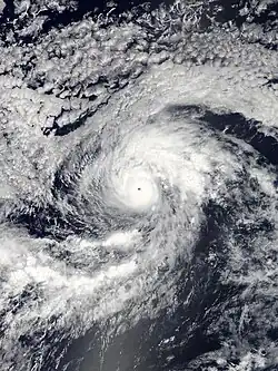 Hurricane Eugene developed from a disturbance located 765 mi (1,231 km) south of the southern tip of the Baja California Peninsula on July 7.[31] On the following day, Eugene underwent a period of rapid intensification; in an 18-hour period starting at 21:00 UTC on July 8, Eugene intensified from a tropical storm with 70 mph (115 km/h) winds to a Category 3 hurricane with 115 mph (185 km/h) winds, making it the first major hurricane of the season.[32][33] However, by 12 hours later, the entrainment of dry air caused Eugene to weaken to a Category 2 hurricane,[34] and due to traveling over cooler waters, Eugene weakened to a tropical storm on the following day.[35] As the coverage of deep convection steadily dwindled, Eugene fell to tropical depression intensity around 15:00 UTC on July 12, and degenerated to a remnant low six hours later.[36][37]