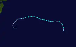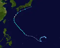 On May 5, Tropical Storm Risk (TSR) issued their first forecast for the season, anticipating an activity of slightly above normal with 27 named storms, 17 typhoons and 10 intense typhoons, including an accumulated cyclone energy (ACE) of 357.[1] On June 26, Taiwan's Central Weather Bureau (CWB) predicted a normal season with 21–25 tropical storms developing over the basin, while three — five systems were expected to affect Taiwan itself.[5] On the same day, the Thai Meteorological Department (TMD) predicted that 2 tropical cyclones would move towards the northern or northeastern parts of Thailand during August or September.[8] On July 6, TSR released their second forecast for the season, reducing the predicted numbers to 25 named storms, 15 typhoons, and 7 intense typhoons, with an ACE Index of 250.[2] During the same day, the PAGASA issued their second and final outlook for the season for the period of July–December, where six to nine tropical cyclones were expected to develop or entered their area of responsibility between July and September, while three to five were forecast during October to December. During August 8, the TSR released their third and final forecast for the season, slightly raising their forecast named storms to 26, with 14 reaching typhoon intensity and 7 reaching intense typhoon intensity. ACE Indices were slightly raised to 255.[3]