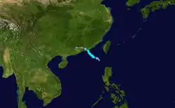 During April 22, the JMA started to monitor a tropical depression that had developed near Guam.[34] After moving westward for a couple of days, the JTWC began issuing advisories, and designated the storm 03W. By April 25, 03W organized and began consolidating further as the JMA upgraded the depression to a tropical storm, giving it the name Muifa.[34] Muifa entered the Philippine Area of Responsibility the following day, and was named Dante by PAGASA.[35] The storm, however, started moving northwards and immediately tracked out of the area by April 27.[36] Following this, both the JMA and the JTWC downgraded Muifa to a tropical depression. Muifa fully dissipated early on April 29, and the JMA issued their final advisory on the storm.[34]