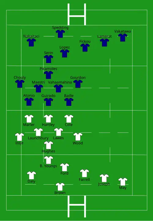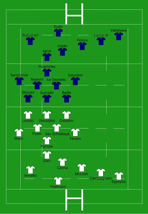 | Try: Parisse 2' m Esposito 80' c Con: Canna (1/2) 80' Pen: Canna (2/2) 16', 27' | Report | Try: Fickou 20' c Vakatawa 47' c Picamoles 66' c Dulin 76' c Con: Lopez (4/4) 21', 48', 71', 77' Pen: Lopez (4/4) 8', 18', 33', 42' |