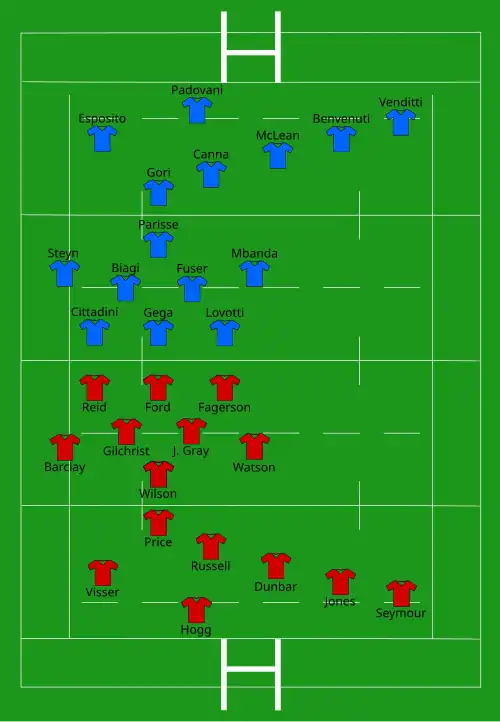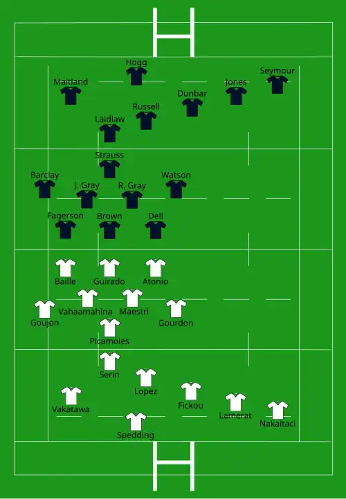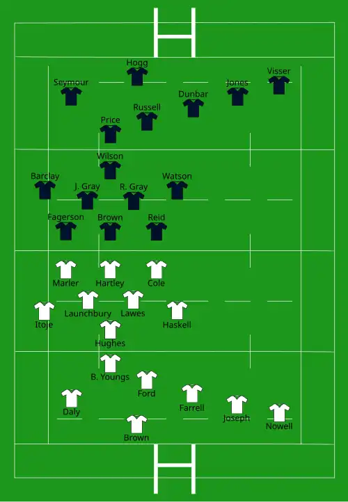 | Try: Hogg (2) 8' c, 20' c Dunbar 28' c Con: Laidlaw (3/3) 9', 21', 29' Pen: Laidlaw (2/2) 72', 80' | Report | Try: Earls 25' m Henderson 47' c Jackson 61' c Con: Jackson (2/3) 48', 62' Pen: Jackson (1/1) 33' |
