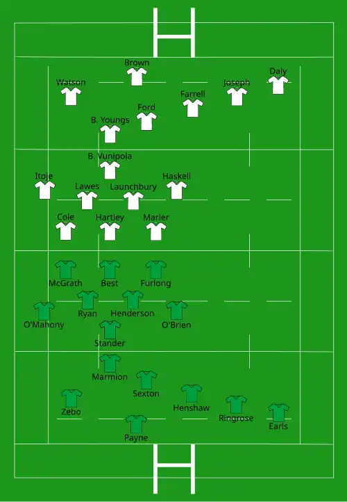 | Try: Russell 27' c Scott 37' m Visser 61' c Seymour 72' c Con: Russell (3/4) 28', 62', 73' Pen: Hogg (1/1) 5' | Report |