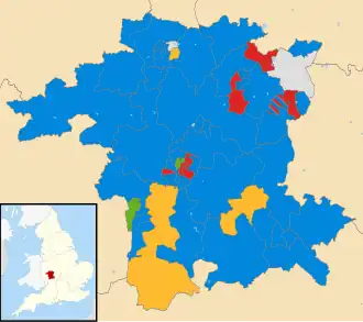 The 2017 Worcestershire County Council election took place on 4 May 2017 as part of the 2017 local elections in the United Kingdom.[1] All 57 councillors were elected from 53 electoral divisions which returned either one or two county councillors each by first-past-the-post voting for a four-year term of office. The Conservatives extended their majority in the council, gaining ten seats, largely at the expense of Labour and UKIP, who lost six seats between them; the Conservative majority increased from one seat to eleven. The number of seats for the Liberal Democrats and Green remained the same, with the Conservatives gaining the remaining five seats from independent politicians and candidates from smaller parties. The Conservatives lost one seat, Alvechurch, to an independent. The Liberals lost their only seat, St Chads in the Wyre Forest district, after they decided not to field any candidates; the Liberal Democrats held the seat, however. UKIP lost all their seats in this election to the Conservatives.