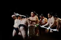 1: Hakuhō and his stablemaster Miyagino are severely reprimanded by the Sumo Association for Hakuhō's inappropriate behavior during his yūshō interview, when he called for Harumafuji and Takanoiwa to return to the ring and led the crowd in "banzai" cheers.[54]