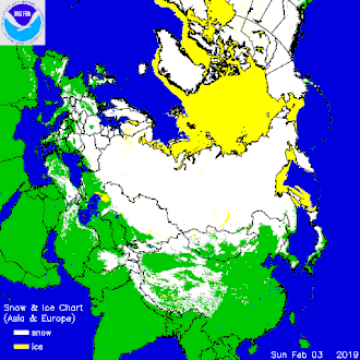 ![]() Map of Europe and Asia snow cover on 3 February 2019. | |