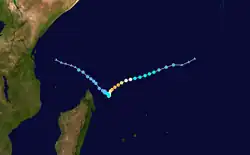 By the next day, Cilida had attained its peak intensity; the MFR estimated winds of 215 km/h (130 mph).[21] Meanwhile, the JTWC estimated high-end Category 4-equivalent winds of 250 km/h (155 mph).[52] On 22 December, convection in the western sector had weakened, indicating an eyewall replacement cycle, as Cilida started steering southeast.[88] The cycle concluded the next day with a larger eye, though it was not well-defined. Cilida made its closest approach of Mauritius, being slightly below 240 km (150 mi) to the northeast.[89] An increase in wind shear and decrease in sea surface temperatures gradually unraveled rainbands, suppressing outflow and weakening the storm.[90] On 24 December, Cilida was downgraded to a severe tropical storm, and was later labeled a post-tropical depression at 18:00 UTC.[21] The vortex elongated as the asymmetrical and shallow storm transitioned into an extratropical cyclone.[91] It degenerated into a remnant low, before dissipating during 28 December.[21]