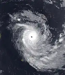 In early-November, low-level vorticity inside the ITCZ indicated the possibility of tropical cyclogenesis between the Chagos Archipelago and Seychelles.[45] The arrival of an active phase of the Madden–Julian oscillation (MJO) boosted this potential, giving a high likelihood of a tropical storm within the next five days.[46] Eventually on 6 November, a tropical disturbance formed after convection organised around a surface circulation over the previous day.[47] Initially inhibited by dry air intrusion, the system intensified into a tropical depression, moving west-southwest along a ridge to the southeast, following strong bursts of convection over the centre.[48] Convective cloud tops of −90 °C (−130 °F) signaled an improvement in the centre; as such, the system was upgraded to a moderate tropical storm, receiving the name Alcide from the Mauritius Meteorological Services (MMS).[49] Alcide then became the first severe tropical storm of the season on 7 November.[15] While attaining Category 1 strength on the Saffir–Simpson scale (SSHWS), Alcide presented a 28-kilometre-wide (17 mi) ragged eye, as convective bands tightened into the core.[50] Alcide was upgraded to a tropical cyclone at 06:00 UTC, with its eye hovering over Agaléga.[16]