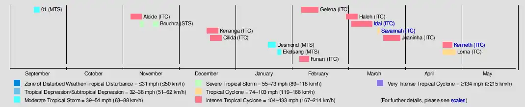 On 1 March, Intense Tropical Cyclone Haleh formed out of an active phase of the Madden–Julian oscillation combined with equatorial waves,[31][32] generally moving south-southwestward and causing no impact towards land.[31] On 4 March, Idai—the deadliest and second costliest tropical cyclone of the South-West Indian Ocean—formed as a tropical depression. Making landfall in Mozambique, the system stayed overland for several days, eventually traversing the Mozambique Channel. The storm rapidly intensified and made a second landfall in Mozambique as an intense tropical cyclone, before quickly dissipating on 15 March.[33] On 18 March, Severe Tropical Cyclone Savannah from the Australian region entered the basin; it rapidly weakened from wind shear, dissipating on 19 March.[34] Joaninha followed, forming on 21 March and becoming a tropical storm later that day. The storm developed and peaked two times as an intense tropical cyclone on 25 and 27 March,[35] being near Rodrigues in the meantime,[36] and dissipated three days later.[35]