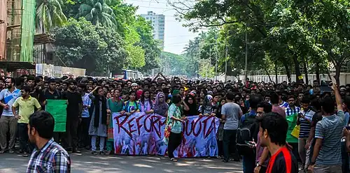 The 2018 Bangladesh quota reform movement was a students' movement demanding reforms in policies regarding recruitment in the Bangladesh government services. Bangladesh Sadharon Chhatra Odhikar Songrokkhon Parishad (Bangladesh General Students' Right Conservation Council) initiated movement initially began in Shahbag and on Dhaka University campus on 17 February 2018, and eventually spread country-wide by 8 April 2018.[2] The movement rapidly attained popularity among students of different universities and colleges forcing the government to announce changes.[3][4]