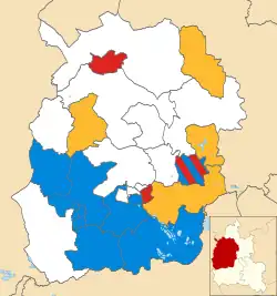 Elections were held for 17 of the 49 seats on the council. Five seats changed hands. The Conservative Party lost five seats, the Liberal Democrats gained three and the Labour Party gained two. The Conservatives remained in overall control of the council with a reduced total of 34 seats.[1] The Liberal Democrats remained the largest opposition group with eight seats. The Labour Party remained the third largest party with six seats.[2]