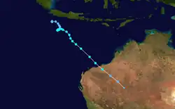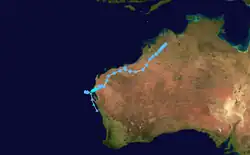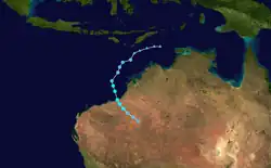 The system continued towards the southwest over the ensuing hours, paralleling the coast of Western Australia. Despite tracking over land, the tropical low showed signs of organisation, with the generally favourable atmospheric conditions allowing the development of formative convective banding in the system's southern semicircle.[87] After reaching the Dampier Peninsula on 20 December, the system turned sharply to the east and began tracking further inland.[88][89] By the following day, the tropical low became slow-moving over the southeastern Kimberley region, during which time a minimum atmospheric pressure of 992.5 hPa (29.31 inHg) was recorded at Halls Creek.[90][91] During the next couple of days, the system continued moving eastward, before dissipating on 23 December.