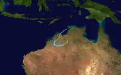 The presence of the Madden–Julian Oscillation and an equatorial Rossby wave in the Australian region contributed to the formation of another broad low-pressure system in the monsoon trough over the far eastern Indian Ocean during early December.[48][49] Initially lacking organised deep convection, the system proceeded to track in a generally southwards direction towards the Kimberley region of Western Australia. By late on 7 December, infrared satellite imagery indicated an improvement in the structure of the low, with the system displaying an increase in flaring deep convection, accompanied by rotation evident in the lower troposphere.[50] Owing to the increase in organisation, the Bureau of Meteorology (BOM) classified the system as a tropical low by 21:00 UTC,[51] when it was located approximately 330 km (210 mi) northwest of Broome.[52] Environmental conditions around the system were conducive for tropical cyclogenesis, with low vertical wind shear, good upper-level outflow and sea surface temperatures near 30 °C (86 °F).[50] Due to the system's proximity to the coast, however, both the BOM and the Joint Typhoon Warning Center (JTWC) forecast only a low chance of development into a tropical cyclone before making landfall.[48][50]