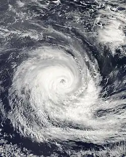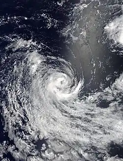 On 6 December, the Bureau of Meteorology (BOM) reported that a tropical low had developed within a monsoon trough near the western end of Java, approximately 200 km (120 mi) north-northeast of Christmas Island.[26][27] The system was assigned the official identifier code 02U upon formation.[26] Initially located in an unfavourable environment for intensification, the tropical low began to encounter somewhat improved conditions as it tracked towards the southeast.[28][29] On 7 December, warm sea surface temperatures and strong diffluence in the upper troposphere fuelled the development of deep convection around the system's low-level circulation centre. Referencing the tropical low's quickly improving structure and the presence of a weak eye feature in microwave satellite imagery, the Joint Typhoon Warning Center (JTWC) issued a Tropical Cyclone Formation Alert for the system at 05:30 UTC.[28] After tracking in a clockwise path around the northeastern side of Christmas Island, Tropical Low 02U became quasi-stationary on 8 December.[30][31] Deep convection continued to develop near the centre during the overnight period, and as the low began to track eastwards, the JTWC upgraded the system to a tropical storm on the Saffir–Simpson hurricane wind scale at 18:00 UTC on 8 December.[32]