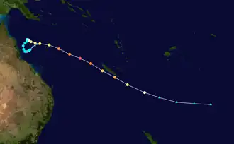On 12 January, the Bureau of Meteorology noted that a monsoonal trough could develop within a week, that would make conditions in the Australian Region basin favorable for tropical cyclogenesis.[127] On 16 January, a weak tropical low formed to the northeast of Queensland.[128] Later that day, the Joint Typhoon Warning Center (JTWC) issued a Tropical Cyclone Formation Alert on the system.[129] At 02:10 UTC on 17 January, the Bureau of Meteorology upgraded the tropical low into Tropical Cyclone Kimi, while located northeast of Cooktown.[130] A small tropical cyclone, Kimi moved slowly southward while remaining offshore of the Australian coastline.[131] Late on 17 January, radar imagery from Cairns developed low-level convective rainbands, which wrapped into the storm's center of circulation.[132] Around this time, Kimi grew large bursts of deep convection, with a well-defined circulation visible on satellite imagery.[133] However organization began to slow on 18 January, with convection becoming displaced to the west of the center.[134] Radar from Townsville and satellite imagery showed that some unexpected wind shear had caused convection to now become displaced to the southeast of the center as the deep convection began to weaken from the wind shear. The wind shear also caused Kimi began to move away from the coast of Australia.[135] Late on 18 January, Tropical Cyclone Kimi weakened into a tropical low while moving slowly away from the North Queensland coast.[136]