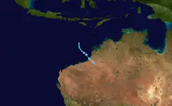 During mid December, favourable conditions from a pulse of the Madden–Julian Oscillation (MJO) located over the eastern Maritime Continent contributed to the re-formation of the monsoon trough over northern Australia.[79] The combined influence of the MJO and the monsoonal conditions generated widespread cloudiness and rainfall across the Australian tropics, leading to an increased likelihood of tropical cyclone formation in the region.[79] On 17 December, a low-pressure system developed within the monsoon trough, near the northern coast of the Top End, and began to move westwards.[80] The Bureau of Meteorology (BOM) classified the system as a tropical low by 06:00 UTC the following day while it was located near the Tiwi Islands, and assigned the identifier code 03U.[81][82] The system soon assumed a southwestward track towards the Kimberley region.[81] Environmental conditions were favourable for tropical cyclogenesis, with low to moderate vertical wind shear, good upper-level outflow and very warm sea surface temperatures nearing 31 °C (88 °F).[83] Despite this, the tropical low's close proximity to land hindered intensification, and only limited development occurred before the system made landfall on 19 December near the Cambridge Gulf, between Wyndham and Kalumburu.[83][84][85] Around this time, the BOM estimated the tropical low's central atmospheric pressure to be 995 hPa (29.38 inHg).[86]