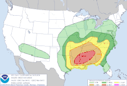 The first indications of organized severe weather came on April 8, when the Storm Prediction Center (SPC) outlined 15% probabilities for severe weather within 25 mi (40 km) of a point from central Texas eastward into the Florida Panhandle and eastern Georgia valid for April 11–12.[2] These threat areas were later refined with the introduction of a day-3 moderate risk, the fourth of five threat levels, across northeastern Louisiana through central Alabama on April 10.[3] Historically, the SPC issues one day-3 moderate risk every year, and half of those over the previous decade were later upgraded to High risk, the highest threat level.[4] Over subsequent days, a significant mid-level shortwave trough progressed eastward across the United States. By the pre-dawn hours of April 12, mid-level cooling associated with the feature overspread the Edwards Plateau, Hill Country, and much of central Texas. Accordingly, an intense line of severe thunderstorms developed along a dry line while vigorous convective development formed farther east.[5] These thunderstorms were initially isolated in nature but soon coalesced into a mesoscale convective system as they encountered an enhanced corridor of warm air streaming northward, as well as very strong wind shear. These initial storms produced scattered weak tornadoes in Texas during the early stages of the outbreak.[6][7]