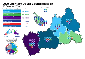 Cherkashchany became the largest party in the Oblast Council, with Servant of the People and For the Future coming second and third respectively, with 12 seats both. European Solidarity, previously called Petro Poroshenko Bloc, was the biggest party in the council in 2015, but fell to fourth place with just 9 seats. Radical Party of Oleh Liashko and Svoboda fell below the 5% threshold and lost their representation.[1]
