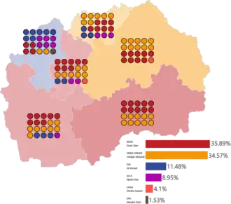 A coalition government was required as neither of the two largest parties hold enough seats to form a majority on their own, and mathematically, any coalition will have to include at least one of the two largest Albanian minority parties. The BDI made its participation in any coalition contingent on the nominee for Prime Minister being an ethnic Albanian, which both the SDSM and VMRO-DPMNE have refused.[32][33][34] The BDI also had increased tensions with both the SDSM and the Alliance for Albanians coalition prior to and during the election, accusing the former of splitting the Albanian vote by allying with the Besa Movement,[35] and being accused by the latter of committing fraud.[36]