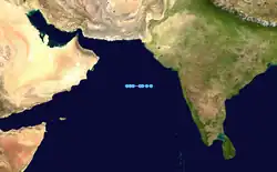 On November 17, the India Meteorological Department (IMD) noted the potential for tropical cyclogenesis over the central Arabian Sea in association with an area of low pressure near the Maldives.[32] Convective activity was enhanced by the Madden–Julian oscillation while sea surface temperatures of 29 to 30 °C (84 to 86 °F) and low wind shear favored additional development.[33][34] By November 18, a weak low-level circulation developed about 1,185 km (736 mi) east-southeast of Socotra.[34] Organization thereafter was stymied as it became embedded within a monsoon trough. Two additional circulations developed to the east and west of the original low; however, the original low steadily became the dominant system by absorbing the previous two circulations.[35] On November 21, two scatterometer passes revealed a single, well-defined low with gale-force winds underneath an area of flaring convection.[36] At 18:00 UTC, the IMD classified the system as Depression ARB 04 about 410 km (250 mi) east-southeast of Socotra.[37] Similarly, the Joint Typhoon Warning Center (JTWC) initiated advisories on the system as Tropical Cyclone 03A. Steered west by a subtropical ridge to the north, little intensification was expected before the cyclone's forecast landfall in Somalia.[36]