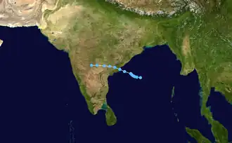On October 20, a low pressure formed over Central Bay of Bengal. The system then became more well-marked on October 21 over West Central Bay of Bengal. It further intensified into depression over northwest Bay of Bengal and adjoining Odisha Coast. The system crossed West Bengal's North 24 Parganas and South 24 Parganas and moved over the adjoining Bangladeshi coast on the noon of October 23 with the maximum wind speed of 45 km/h (30 mph). The system weakened into a well marked low-pressure area, 50 km north-northwest of Dhaka on the morning of October 24.[30][31]