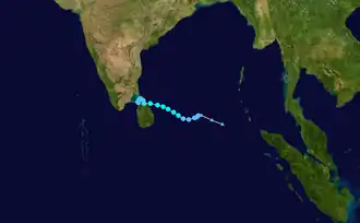 On November 28, a low-pressure area formed off the coast of Aceh. It gradually intensified into a depression on November 30.[50] The JTWC then issued a Tropical Cyclone Formation Alert on the system, that same day.[51] At 03:00 UTC on December 1, the depression was upgraded into a deep depression.[52] At 15:00 UTC, both the IMD and JTWC upgraded it to a cyclonic storm and tropical storm respectively and it was named Burevi, the fifth named storm of the season.[53][54] The name was initially suggested by the Maldives.[55] At this time, microwave imagery showed well-defined convective banding wrapping tightly around the low-level circulation (LLCC).[56] At 15:00 UTC on December 2, Burevi reached its peak intensity with 1-minute sustained winds of around 85 km/h (55 mph) and a barometric pressure of 996 mbar (29.4 inHg).[57] Shortly afterwards, Burevi made landfall along the east coast of Sri Lanka according to the Sri Lanka's Department of Meteorology.[58]
