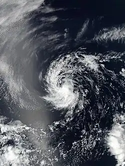A tropical wave emerged off the west coast of Africa on June 20 and crossed into the East Pacific on July 3, where it interacted with the monsoon trough and began to organize. This system developed a defined surface low on July 6 and was classified as a tropical depression about 435 mi (700 km) south of Acapulco, Guerrero. Steered along a northwest trajectory by a mid-level ridge, the depression traversed a region of favorable conditions which enabled slow intensification.[28] Initial predictions from the NHC suggested significant strengthening of the cyclone.[29] However, Cristina instead encountered cooler waters and eventually drier air; it reached its peak intensity late on July 10 with winds of 70 mph (110 km/h) as it passed west of Socorro Island. Thereafter, the cyclone turned west along the south side of the subtropical ridge and steady weakened. The storm degraded into a remnant low around 18:00 UTC on July 12 and degenerated into a trough on July 15 about halfway between Hawaii and Baja California Sur.[28]