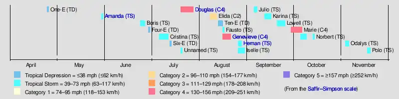 A burst of activity occurred in early August, with a tropical wave south of Mexico evolving into Tropical Storm Elida on August 9, later to become the second hurricane of the season. Elida was generally short lived, but with the formation of Tropical Depression Ten-E, Tropical Storm Fausto, and Hurricane Genevieve activity continued. Genevieve later became the second major hurricane of the season before briefly effecting Baja California Sur as a minimal hurricane. Two additional tropical cyclones, Tropical Storms Hernan and Iselle, formed in late August. Both were generally weak and did not make landfall, although the former brought heavy flooding and mudslides to western Mexico. Later, on September 5, the remnants of former Atlantic tropical cyclone Nana reformed into a new cyclone in the Pacific named Julio. After Julio, Karina and Lowell formed. Near the end of September, Hurricane Marie formed and rapidly intensified up to Category 4 strength before weakening out to sea, becoming the strongest storm of the season. The only October storm of the season, Norbert, lasted for 10 days. After almost a month of inactivity, Odalys formed on November 3, and dissipated three days later without affecting land. Tropical Storm Polo formed close to the end of the season, but it was also short-lived and weak.