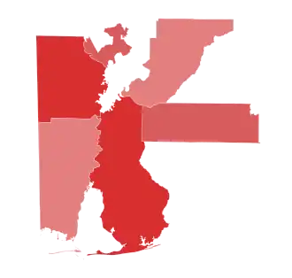 The 1st district is home to the city of Mobile, and includes Washington, Mobile, Baldwin, Escambia and Monroe counties. The incumbent was Republican Bradley Byrne, who was re-elected with 63.2% of the vote in 2018,[2] and announced on February 20, 2019, that he would seek the Republican nomination for U.S. Senate in 2020.[3]