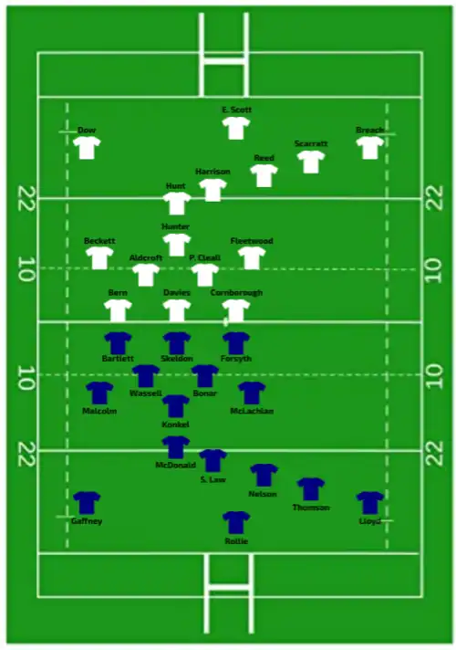 | 13:30 GMT (UTC±00:00) | Report | Try: Bern 3' c Breach 31' m Dow (2) 37' c, 56' m E. Scott (2) 43' m, 49' c Hunter 64' c MacDonald 77' c Con: Scarratt (5/8) 4', 38', 49', 65', 78' Pen: Scarratt (1/1) 19' |