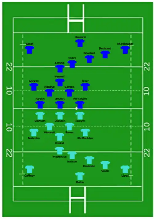 | 12:00 GMT (UTC±00:00) | Report | Try: Banet (2) 3' m, 37' c Sansus (2) 30' c, 51' m N'Diaye 47' c M. Ménager 63' c Annery 67' m Boudard 76' c Con: Trémoulière (5/8) 31', 39', 48', 64', 78' |