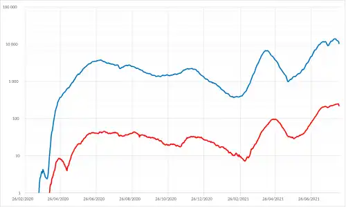 The "general holiday" (lockdown) due to end on 4 April was extended to 11 April, then to 14 April, then to 25 April and then again to 5 May.[39] Bangladesh crossed the figure of 100 confirmed cases on 6 April and 1,000 confirmed cases on 14 April. On 20 April, the number of confirmed deaths crossed 100.[40]