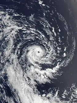 During April 3, the FMS and the BoM started to monitor Tropical Disturbance 10F/31U, which had developed about 410 km (255 mi) to the northwest of Port Vila in Vanuatu.[41][42] The next day, in an unofficial bulletin, the JTWC classified the system as a "tropical cyclone", when it reached 35 knots on the Saffir-Simpson scale.[43] The FMS did the same and was named Fili. The eye formed at its center, and the FMS upgraded the system to Category 2 cyclone with 10-min winds at 70 mph and a pressure of 977 mbar. Fili started to weaken as it moved to an area of subtropical confection and the JTWC reclassified Fili as a subtropical storm. Fili dissipated on April 9.