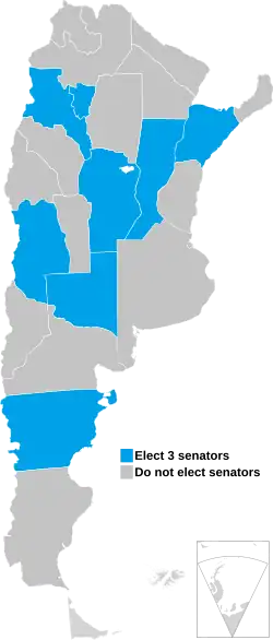 The 72 members of the Senate are elected in the same 24 constituencies, with three seats in each. The party receiving the most votes in each constituency wins two seats, with the third seat awarded to the second-placed party.[25] The 2021 elections will see one-third of Senators renewed, with eight provinces electing three Senators; Catamarca, Chubut, Córdoba, Corrientes, La Pampa, Mendoza, Santa Fe and Tucumán.[24]