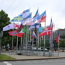 On May 24, 2021, following the Ryanair Flight 4978 incident, Latvian officials replaced the Belarusian state flag in Riga with the former flag faced with the former coat of arms used by opposition groups, including at the 2021 IIHF World Championship display of flags, which was replaced by Mayor of Riga Mārtiņš Staķis and Minister of Foreign Affairs of Latvia Edgars Rinkēvičs. As a result, Belarus expelled the entire Latvian embassy from their country.[22] The IIHF issued a statement protesting the replacement of the flag, and IIHF president René Fasel asked Riga's mayor to remove the IIHF name, flag and symbols from such sites, or to restore the flag, insisting that the IIHF is an "apolitical sports organization".[23] In response, Staķis said he would remove the IIHF flags.[24][25] On May 28, 2021, Belarus opened a criminal case against Staķis and Rinkēvičs, accusing them of fuelling "national enmity".[26]