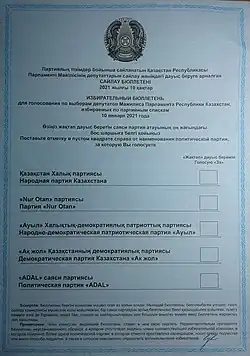 - ^ "Выборы в мажилис пройдут в традиционном очном формате и по бумажным бюллетеням". informburo.kz (in Russian). 2020-10-22. Retrieved 2020-11-23.