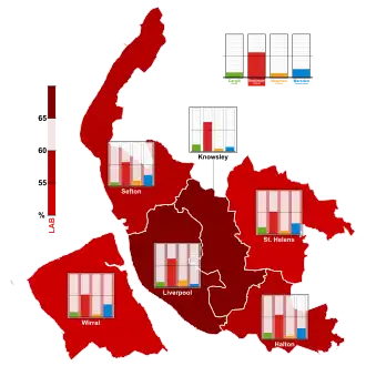 The position of Mayor of the Liverpool City Region was created in 2017 following a devolution deal between the UK government and the Liverpool City Region Combined Authority (LCRCA). The Cities and Local Government Devolution Act 2016 required a directly elected metro mayor for combined authorities to receive additional powers from central government.[2] Under the terms of the devolution deal, the first mayoral term was set to last until 2020, followed by elections every four years.[3] The Liverpool City Region is defined as having six boroughs which includes the county of Merseyside (Knowsley, Liverpool, St Helens, Sefton, and Wirral) and the Borough of Halton.