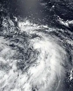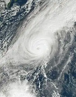 At 00:00 UTC on June 18, the JTWC started to monitor a broad area of convection nearly 250 km (160 mi) to the south-southwest of Pohnpei.[92] The system remained weak as it moved northwestwards in a favorable environment for further intensification, characterized by warm sea surface temperatures, low to moderate wind shear and good outflow; the disturbance remained weak as it moved northwestwards.[92][93] The JTWC issued a TCFA on the system two days later, though the system remained disorganized.[94][95] The JMA upgraded the system to a tropical depression at 00:00 UTC on June 21.[96] Meanwhile, the JTWC designated it as 06W in their first advisory on the system, with an exposed LLCC being evident on satellite imagery due to moderate wind shear, being induced by a tropical upper tropospheric trough to its north.[97][98] By 21:00 on June 21, 06W made its closest passage to the south-southwest of Guam, continuing its northwest track.[99][100] On June 22, at 06:00 UTC, the JTWC upgraded the system into a tropical storm as it continued to move away from Guam.[101] The JMA followed and upgraded the system into a tropical storm, in June 23 at 00:00 UTC, and assigned it the name Champi.[102] At 18:00 UTC, the JMA upgraded the storm to a severe tropical storm as it turned northwestwards.[103] At this time, a microwave imagery scan of Champi revealed an eye feature emerging in the system; however, this was short lived as dry air continued to impact the storm from the west.[104] In addition, poleward outflow on the system remained weak on June 24, restricting Champi to significantly develop.[105] However, on the next day, as a shortwave trough crossed the Ryukyu Islands, the outflow increased on the storm which allowed it to intensify further.[106] On June 25, at 06:00 UTC, the JMA officially declared the storm a typhoon.[107] The JTWC soon followed, upgrading it into a Category 1-equivalent typhoon.[108] At this time, a Champi turned north and north-northwestwards, and subsequently reached its peak intensity of 120 km/h (75 mph) ten-minute maximum sustained winds with a minimum barometric pressure of 980 hPa (28.94 inHg) by 21:00 UTC on June 25, however it was downgraded to a tropical storm a day later.[109] The storm continued to weaken as it move towards the Japanese islands, until on June 27, the JMA issued its last advisory at 12:00 UTC as the system became an extratropical low.[110] The JTWC also issued its last warning for Champi at 09:00 UTC, same day.[111]