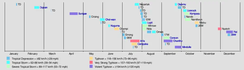 The 2021 Pacific typhoon season was the second consecutive season to have below average tropical cyclone activity, with twenty-two named storms, and was the least active since 2011. Nine became typhoons, and five of those intensified into super typhoons. This low activity was caused by a strong La Niña that had persisted from the previous year. The season's first named storm, Dujuan, developed on February 16, while the last named storm, Rai, dissipated on December 21. The season ran throughout 2021, though most tropical cyclones typically develop between May and October. The season's first typhoon, Surigae, reached typhoon status on April 16. It became the first super typhoon of the year on the next day, also becoming the strongest tropical cyclone in 2021. Surigae was also the most powerful tropical cyclone on record in the Northern Hemisphere for the month of April.[1] Typhoons In-fa and Rai are responsible for more than half of the total damage this season, adding up to a combined total of $2.02 billion.[nb 2]