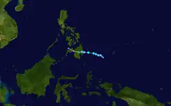 On May 11, the JTWC noted a persistent area of convection in the Philippine Sea, approximately 184 nmi (341 km) west of Palau.[41] The JTWC issued a TCFA for the convection on May 12, as it further developed in an environment with low vertical wind shear and warm sea surface temperatures.[42] Just three hours later, the agency recognized that the area of convection had quickly consolidated into a tropical depression and assigned it with the identifier of 03W.[43] Around the same time, the JMA had also recognized the storm as a tropical depression while it was to the east of Mindanao.[44] Since the storm developed within the Philippine Area of Responsibility, the PAGASA immediately named the storm Crising once the agency recognized it as a tropical depression as well, and later raised Signal No. 2 warnings for areas in Mindanao.[45][46] In the early hours of May 13, the JTWC upgraded the system into a tropical storm, with the PAGASA following suit hours later.[47][48] Later that day, Crising's low-level circulation center became exposed due to wind shear, and it lost organization. At 8:20 p.m. Philippine Standard Time (12:20 UTC), Crising made landfall in Baganga, Davao Oriental as a weakening tropical storm. It quickly degraded as soon as it made landfall, with both the JTWC and the PAGASA downgrading it to a tropical depression at 15:00 UTC.[49][50] At 03:00 UTC on that day, the PAGASA reported that the system degenerated to an area of low-pressure in the vicinity of Piagapo in Lanao del Sur, thus lifting all warning signals on Mindanao and issuing their final advisory.[51] On May 14, the system dissipated over the Sulu Sea, and both the JMA and the JTWC issued their final advisories on the storm.