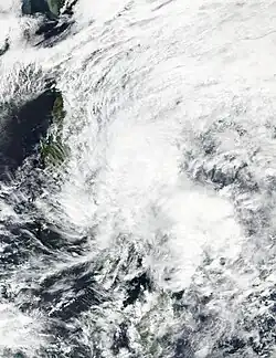 On June 10, the JTWC started to monitor an area of low-pressure in the South China Sea, approximately 518 km (322 mi) to the south of Hong Kong, with the agency classifying the system as a monsoon depression.[85] Tracking west-northwestward, the storm was located in a favorable environment for further development, with warm sea surface temperatures and low wind shear.[86] At 00:00 UTC on June 11, the JMA upgraded the system into a tropical depression.[87] Six hours later, the JTWC issued a TCFA for the system as it began to show characteristics of a monsoon depression.[88] By 18:00 UTC, the JMA upgraded the system to a tropical storm, assigning it the name Koguma.[87] On June 12 at 00:00 UTC, the JTWC upgraded Koguma to a tropical depression, assigning it the designation 05W.[89] Later that day, the JTWC also upgraded Koguma to a tropical storm.[89] By June 12, it had made landfall southeast of Hanoi,[90] and dissipated the next day.[87]