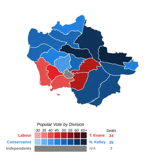 The council was left in no overall control, with neither party holding a majority of the seats and the balance of power falling to the seven independent councillors.[36] Of the independent councillors, five were former Conservatives who left the party over Kelly's leadership and two former Labour councillors.[37] Kelly said on 11 May that he had contacted former Conservative councillors to seek their support.[37] Evans said that Kelly's success in the election gave him the "right to make the first move" in seeking to control the council, and that Labour wouldn't seek independent support.[38]