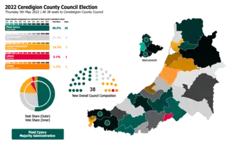 The 2022 Ceredigion County Council election took place on 5 May 2022 to elect 38 members to Ceredigion Council. On the same day, elections were held to the other 21 local authorities and to community councils in Wales as part of the 2022 Welsh local elections. The previous all-council election took place in May 2017 and future elections will take place every five years.